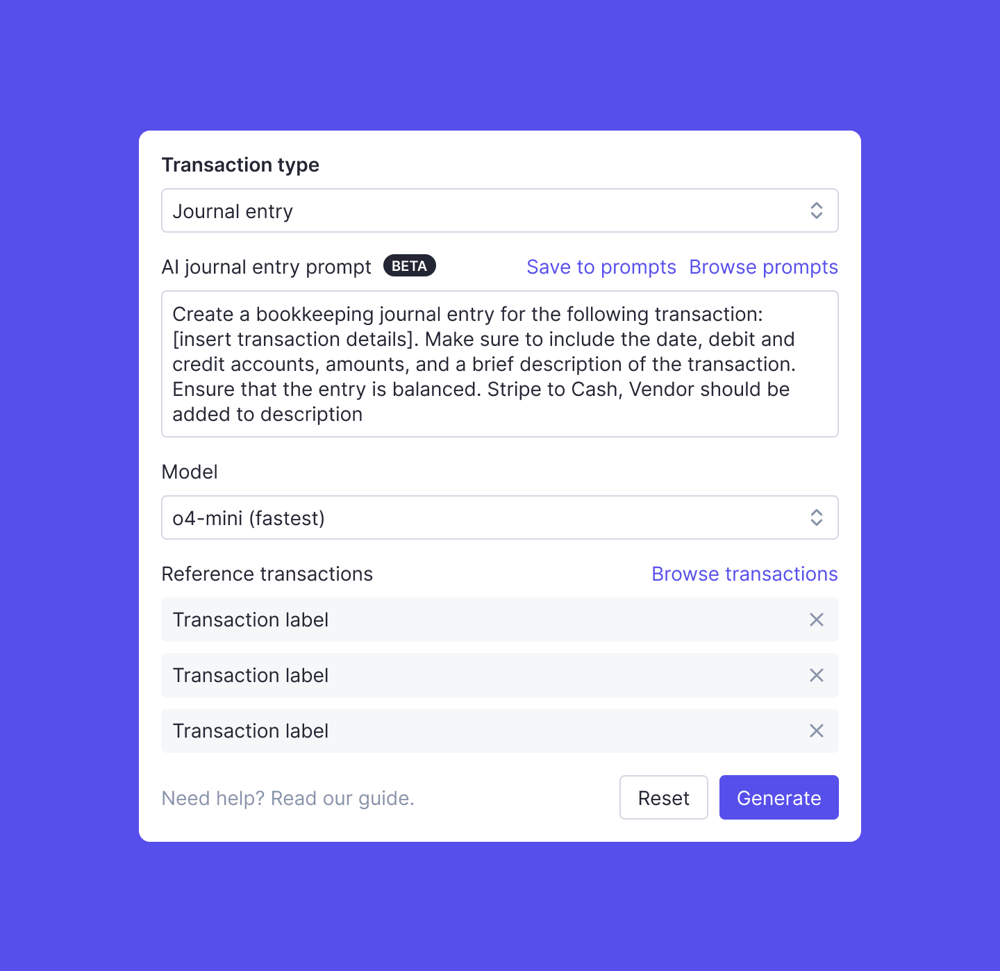 Select from Double's pre-built templates (including ones tailored for complex entries like HUD documents), reuse custom prompts from previous closes, or write a new prompt to guide the journal entry creation.