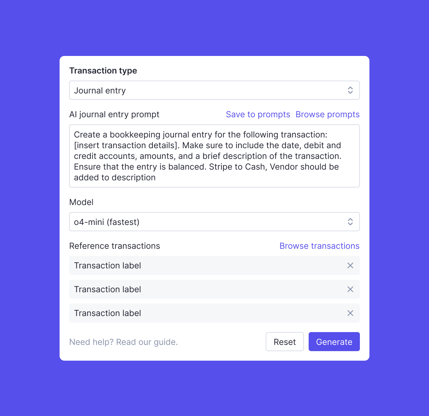 Select from Double's pre-built templates (including ones tailored for complex entries like HUD documents), reuse custom prompts from previous closes, or write a new prompt to guide the journal entry creation.