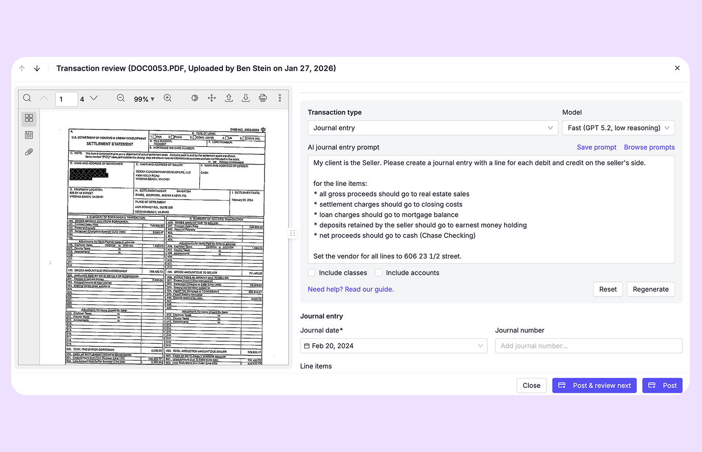 Turn source files into journal entries in minutes by automating the conversion of complex documents like payroll reports and HUD-1 settlements into ready-to-post journal entries.