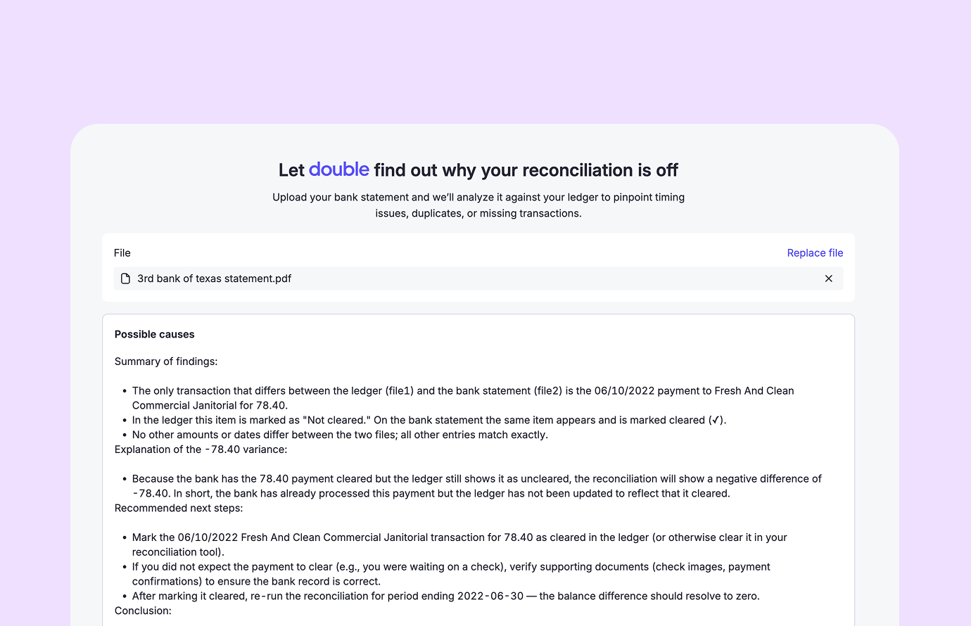 When a reconciliation doesn’t tie, Double’s AI is there to help. With one click, you can analyze the difference by comparing your bank or credit card statement directly against the ledger to pinpoint what’s causing the discrepancy.
