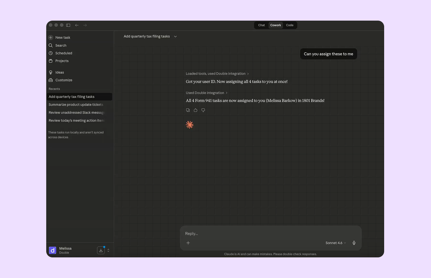 Double's MCP server connects your Double account to Claude, ChatGPT, or any MCP-compatible AI agent so you can read and update your work without switching apps.