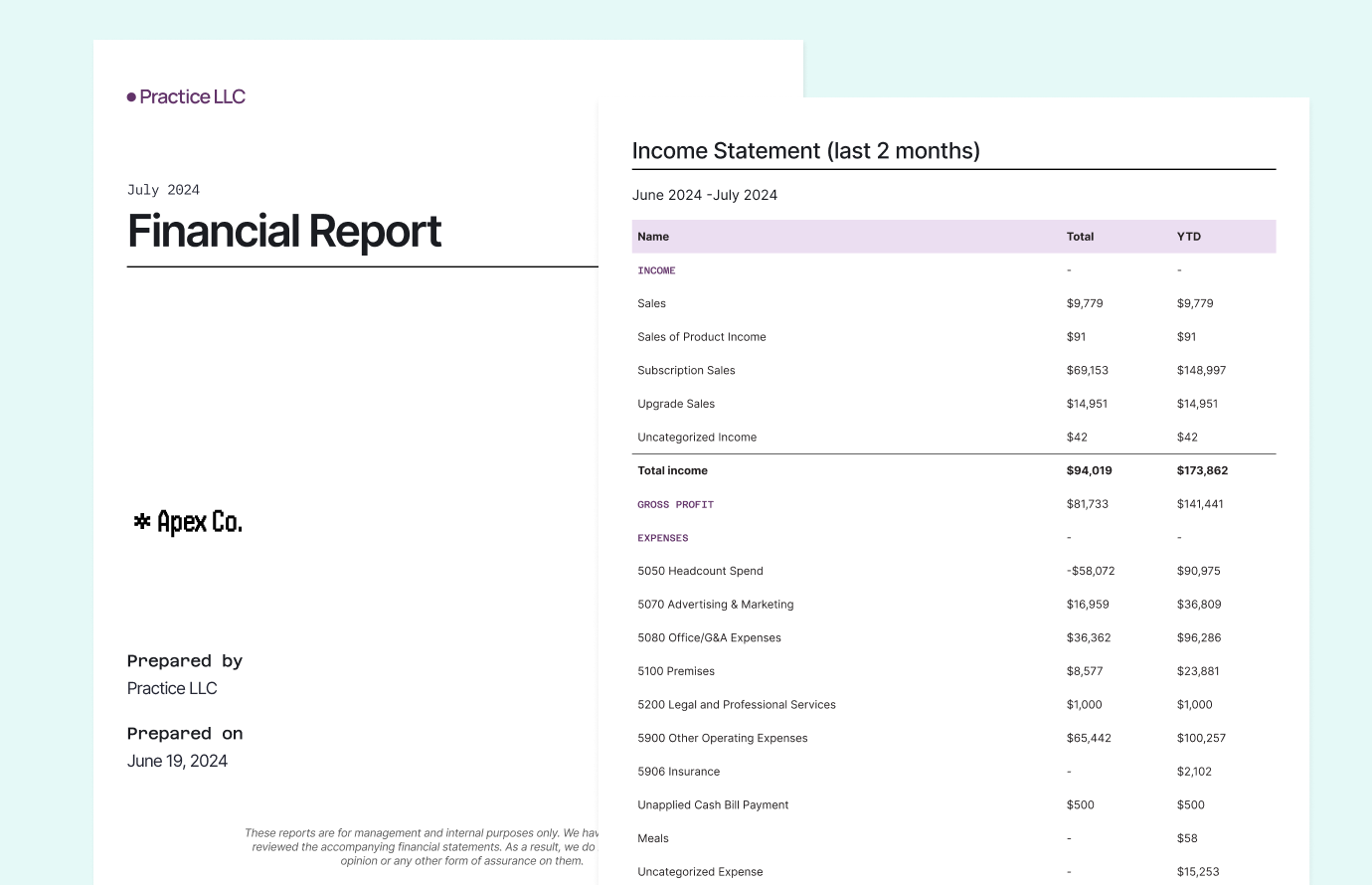 By connecting to your client’s general ledger, Double allows you to create and share a full financial reporting package in just four clicks. From there, your team can freely customize the layout – such as disabling unnecessary sections, adding footnotes, or adjusting date ranges.