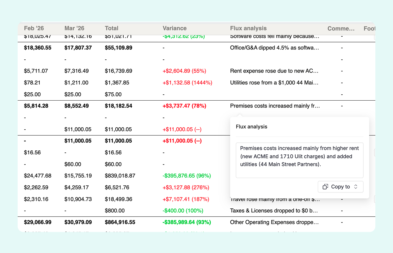 Automatically identify material changes and draft context-aware narratives by drilling into underlying vendor or customer data, no Excel exports required.