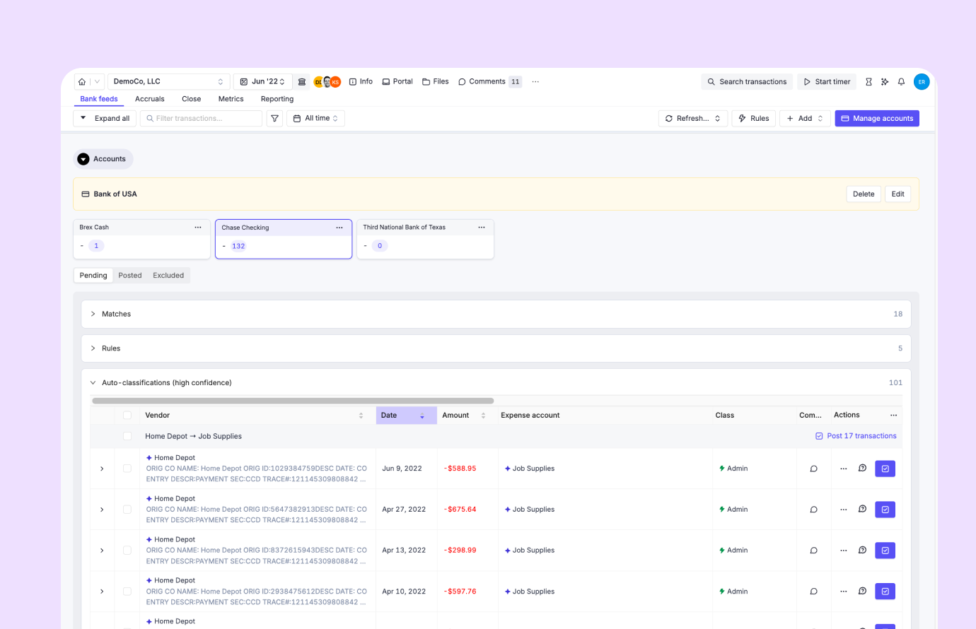 Automate transaction categorization, journal entries, and accruals in one live system.